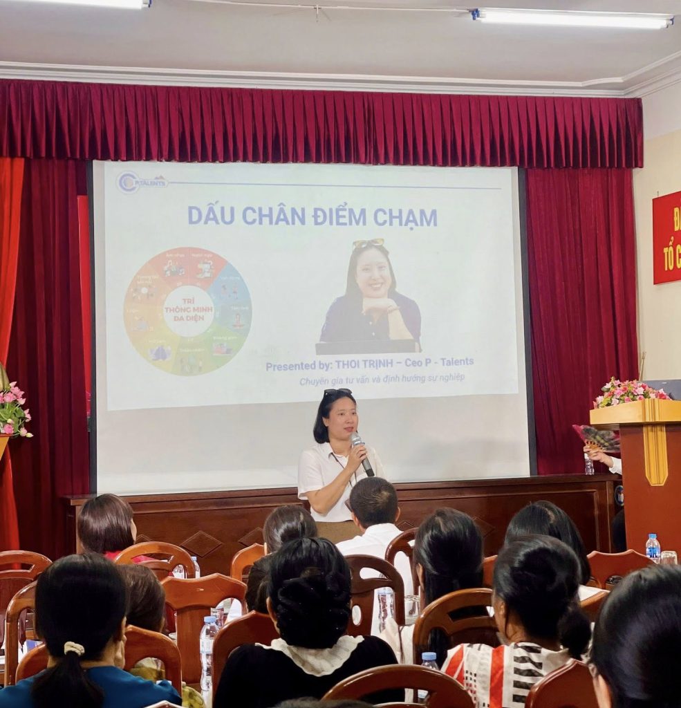 Tại hội trường trường THPT B Nguyễn Huệ, buổi chia sẻ với chủ đề “Dấu chân điểm chạm” đã diễn ra đầy cảm xúc. Speaker Trịnh Thị Thoi – CEO P-Talents đã mang đến những góc nhìn mới mẻ về: